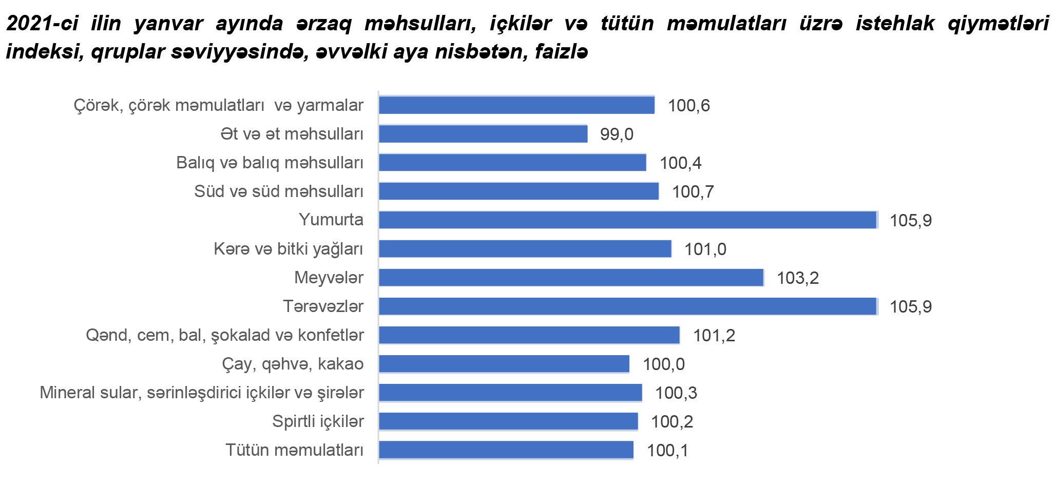 2021-ci ilin yanvar ayında ərzaq məhsulları, içkilər və tütün məmulatları üzrə istehlak qiymətləri indeksi əvvəlki aya nisbətən 1,4 faiz artıb.