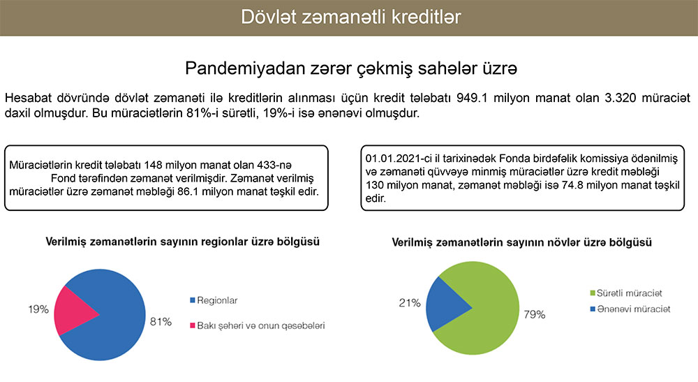 “Müraciətlərin kredit təlabatı 148 milyon manat olan 433-nə Fond tərəfindən zəmanət verilib. Kredit təlabatı 801,1 milyon manat olan 2887 müraciətə isə imtina cavabı verilib”.