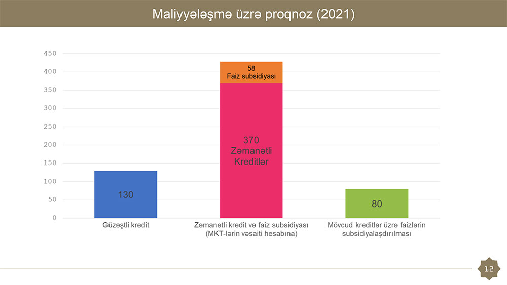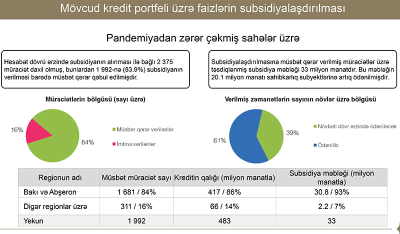 Qeyd edək ki, biznes kreditlərinə dövlət zəmanətinin verilməsi və həmin kreditlər üzrə faizlərin subsidiyalaşdırılması mexanizminə əsasən, kreditin 60%-dək hissəsinə dövlət zəmanəti verilir, həmçinin həmin kreditin illik faiz dərəcəsinin 50%-i dövlət tərəfindən maliyyələşdirilir. Bu mexanizm müddəti 3 ilədək, illik faiz dərəcəsi 15%-dən çox olmayan kreditlərə şamil edilir. Bu kreditlər üzrə güzəşt müddəti 12 aya qədərdir. Güzəşt müddətində sahibkarlıq subyekti yalnız faiz borcunu ödəməlidir.