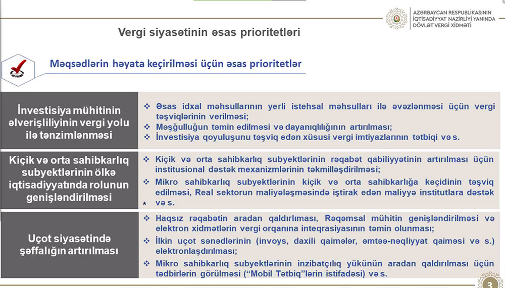 Vergi siyasətində cari və ortamüddətli dövr üçün əsas strateji hədəflər açıqlanıb.