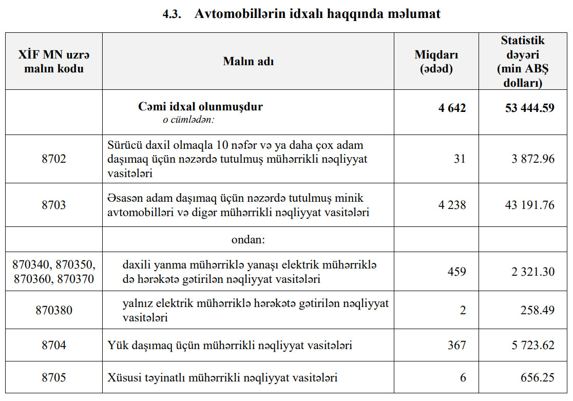 2021-ci ilin yanvar ayında Azərbaycana 53 milyon 445 min dollar dəyərində 4642 ədəd avtomobil idxal edilib.