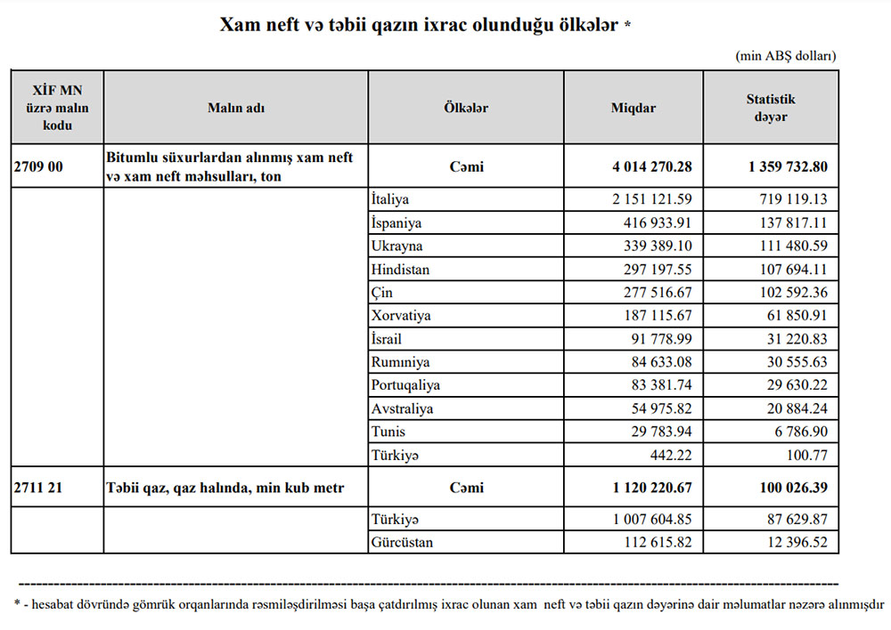 2020-ci ilin yanvar ayında Azərbaycandan 1 milyard 960 milyon 560 min dollar dəyərində 3 milyon 986 min 95 ton bitumlu süxurlardan alınmış xam neft və xam neft məhsulları ixrac edilmişdi.