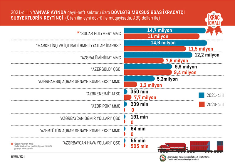 Qeyri-neft sektoru üzrə ixrac əməliyyatlarında iştirak edən dövlətə məxsus şirkətlərin siyahısına isə “Socar Polymer” MMC və Azərbaycan Respublikası Dövlət Neft Şirkətinin “Marketinq və İqtisadi Əməliyyatlar İdarəsi” başçılıq edir. Daha sonra bu siyahıda aşağıdakı şirkətlər təmsil olunurlar: "Azəralüminium" MMC, "Azergold" QSC, "Azərpambıq Aqrar Sənaye Kompleksi" MMC, "Azərenerji" ATSC, “Azəripək” MMC, "Azərbaycan Dəmir Yolları" QSC, “Azərtütün Aqrar Sənaye Kompleksi” MMC və "Azərbaycan Hava Yolları" QSC.