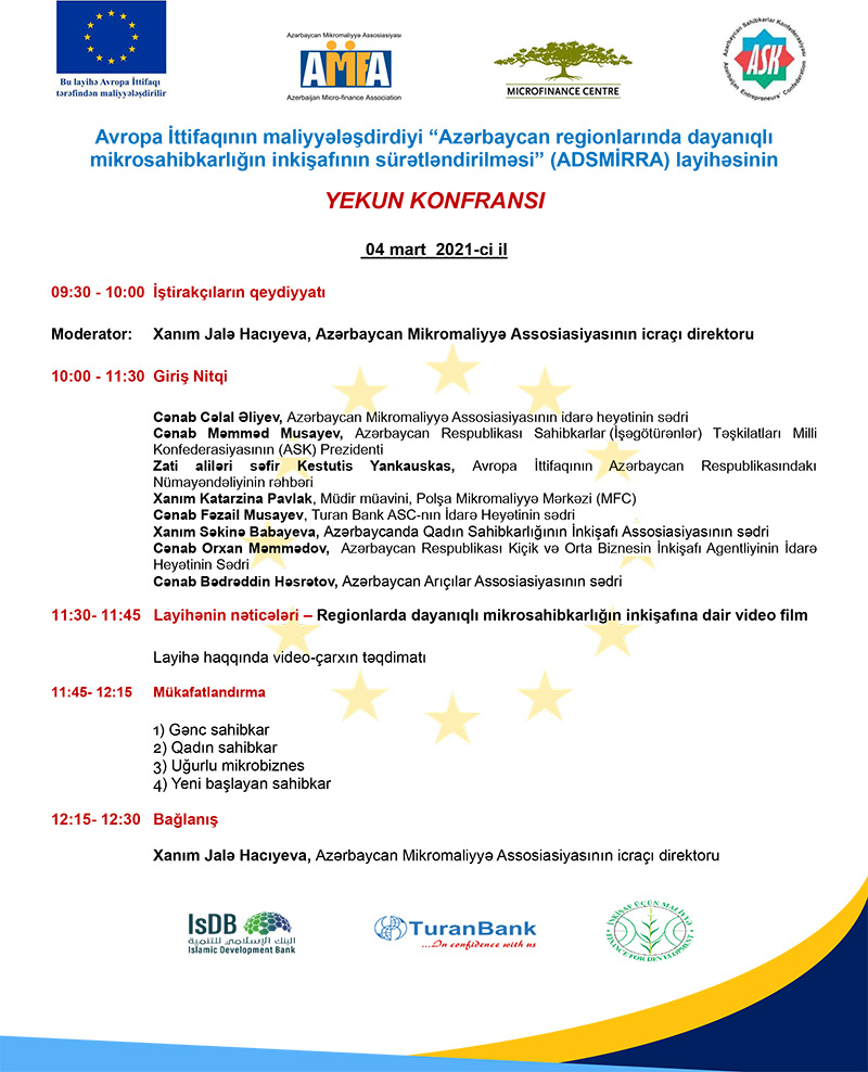 Azərbaycan Mikromaliyyə Assosiasiyası (AMFA) Avropa İttifaqı tərəfindən maliyyələşdirilən “Azərbaycan regionlarında dayanıqlı mikrosahibkarlığın inkişafının sürətləndirilməsi” (ADSMIRRA) layihəsinin Yekun Konfransını keçirəcək.
