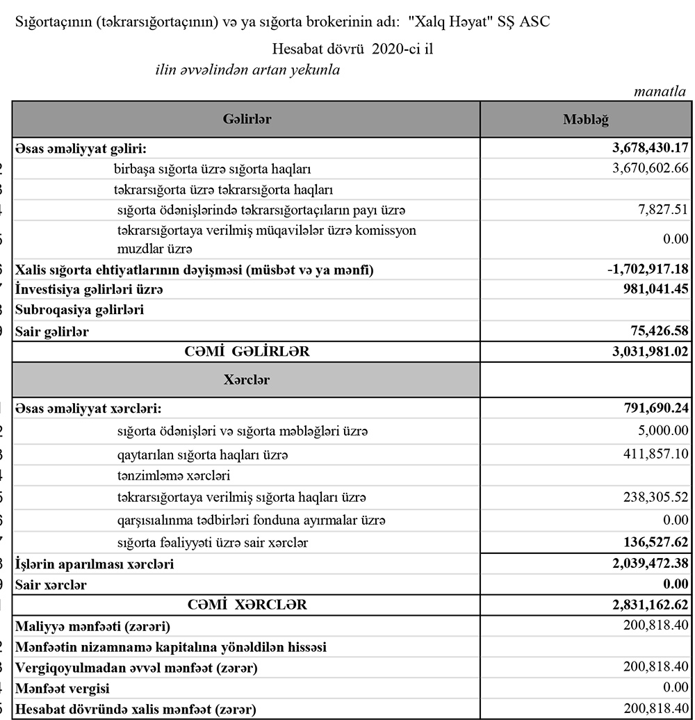 Marja xəbər verir ki, 2020-ci ildə "Xalq Həyat"nın cəmi əməliyyat gəlirləri 3 milyon 32 min manat, cəmi əməliyyat xərcləri 2 milyon 831 min manat, əməliyyat mənfəəti 201 min manat təşkil edib. Şirkət ötən il mənfəət vergisi ödəməyib.