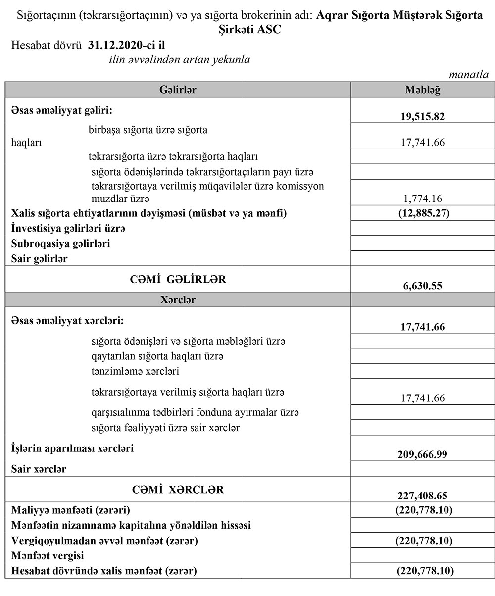 Ötən il avqust ayında dövlət qeydiyyatına alınmış Aqrar Sığorta Müştərək Sığorta Şirkəti ASC həmən ili 221 min manat xalis zərər ilə başa vurub.