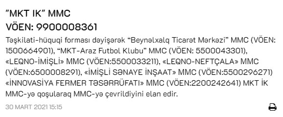 Marja xəbər verir ki, “Beynəlxalq Ticarət Mərkəzi”, “MKT-Araz Futbol Klubu”, “Leqno-İmişli”, “Leqno-Neftçala”, “İmişli Sənaye İnşaat”, “İnnovasiya Fermer Təsərrüfatı” MMC-lərin ləğv olunaraq "MKT İstehsalat Kommersiya"ya birləşiblər.