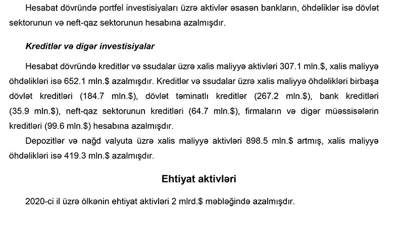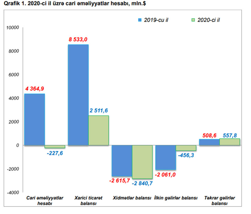 2020-ci ildə cari əməliyyatlar hesabında isə 227.6 milyon dollar kəsir yaranıb2020-ci ildə Azərbaycanın tədiyyə balansında 1 milyard 987,7 milyon dollar kəsir yaranıb. Halbuki, 2019-cu ildə Azərbaycanın tədiyyə balansında 5 milyard 142.9 milyon dollar profisit olmuşdu.