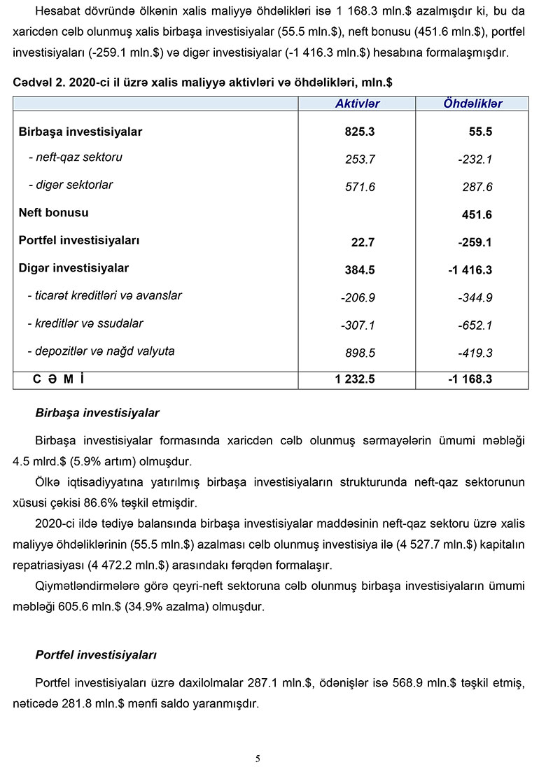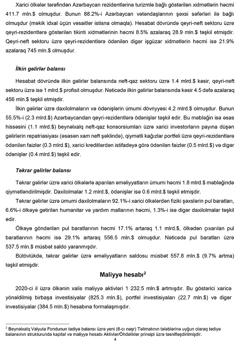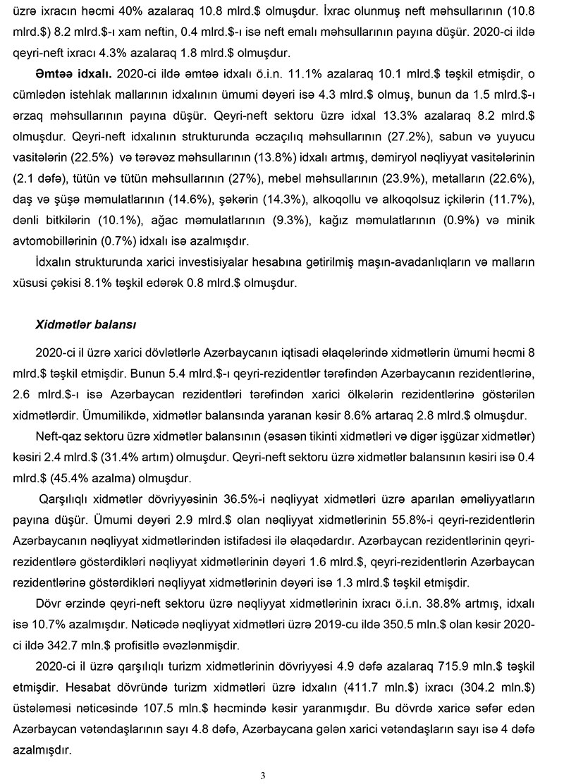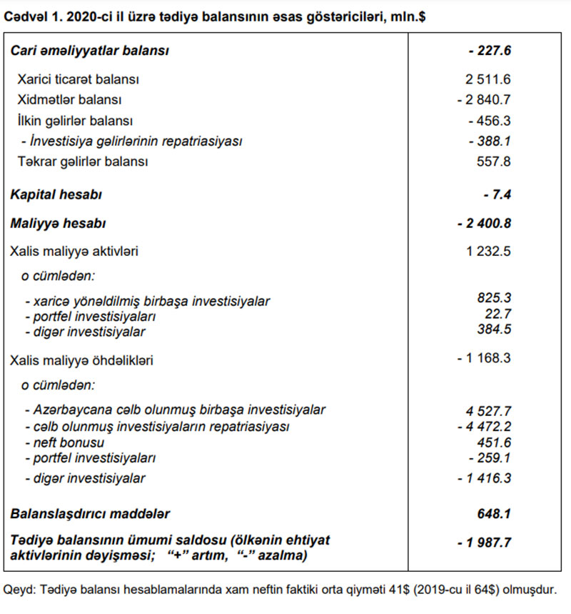 2020-ci il üzrə Azərbaycan Respublikasının Tədiyyə balansında bildirilir ki, xarici mühitin əlverişsiz olduğu bir şəraitdə 2020-ci ildə tədiyə balansının əsas komponenti olan cari əməliyyatlar balansı (CƏB) tarazlığa yaxın olmuşdur. Cari əməliyyatlar balansına əsas ixrac qiymətlərinin dəyişimi təsir göstərmişdir. Bu dövrdə qeyri-neft sektoru üzrə CƏB-in yaxşılaşması davam etmişdir. Pandemiya şəraitində qeyri-neft sektoru üzrə əmtəə və xidmət idxalının azalması tədiyə balansına tarazlaşdırıcı təsir göstərmişdir.