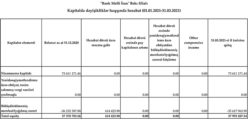 "Bank Melli İran" Bakı filialı 2021-ci ilin 1-ci rübünü (yanvar-mart) 614 min 423 manat xalis mənfəət ilə başa vurub. Müqayisə üçün qeyd edək ki, "Bank Melli İran" Bakı filialı 2020-ci ilin 1-ci rübünü 234 min 172 manat xalis mənfəəət ilə bağlamışdı. Beləliklə, filialın xalis mənfəəti 2,6 dəfə artıb.
