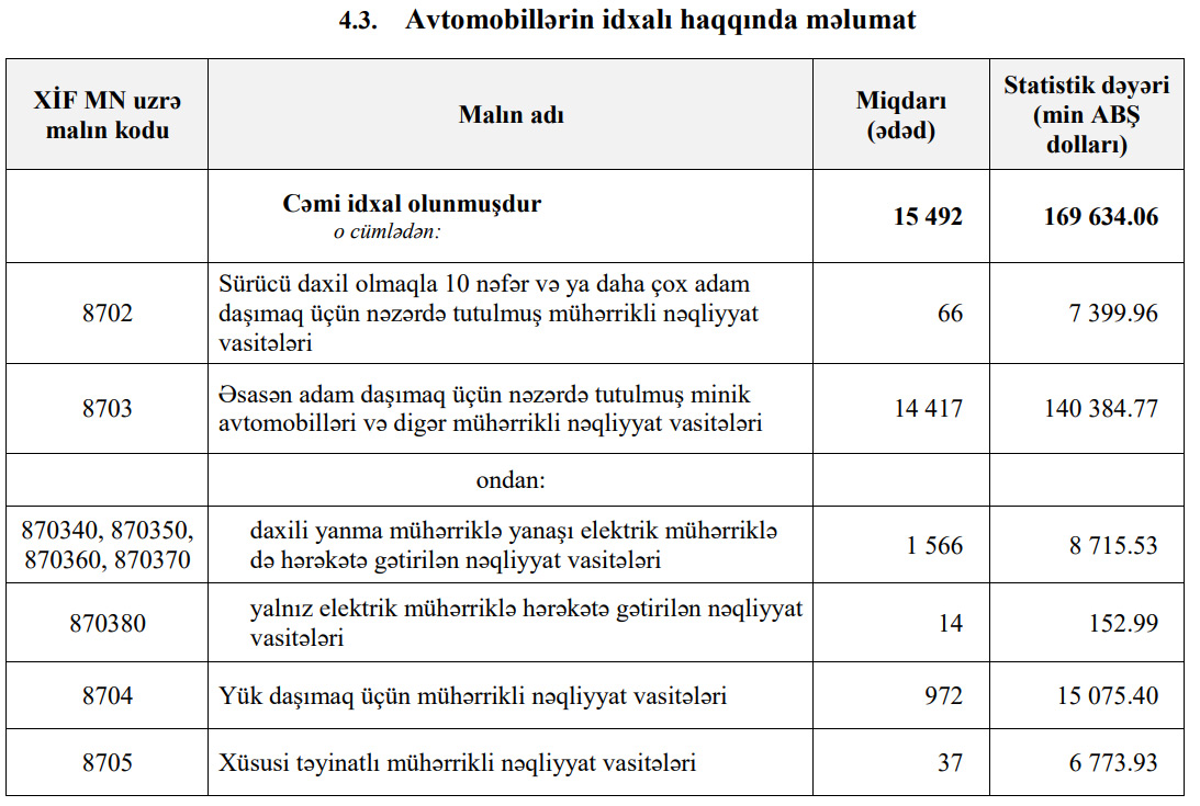 2020-ci ilin yanvar-mart aylarında Azərbaycana 169 milyon 634 min dollar dəyərində 15 min 492 ədəd avtomobil idxal edilmişdi.