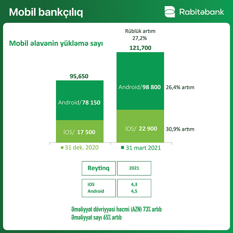 Bütün bank xidmətlərini sürətlə rəqamsal sferada da genişləndirən “Rabitəbank”ın mobil tətbiqi “Rabita Mobile”ın yükləmə sayı 27.2% artaraq 121 minə çatıb. Bu rüb ötən ilin sonu ilə müqayisədə bankın mobil əlavəsi vasitəsilə aparılan kartla əməliyyat dövriyyəsi məbləğ olaraq 73%, say olaraq isə 65 % artıb.