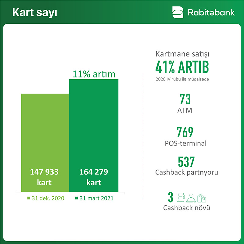 2021-ci il “Rabitəbank” üçün kart biznesi sahəsində də uğurlu başlanğıc olub. Ötən ilin sonundakı göstərici ilə müqayisədə kart sayları 11% artaraq 164 min təşkil edib. Keşbek kartı olan Kartmane debet kartının bu rüb ərzindəki satışı 40%-dən çox artıb. Bankın kart məhsulunun populyarlaşması nəticəsində bankın plastk kart sahəsindəki gəlirləri 2020-ci ilin analoji rübü ilə müqayisədə 56% artıb.