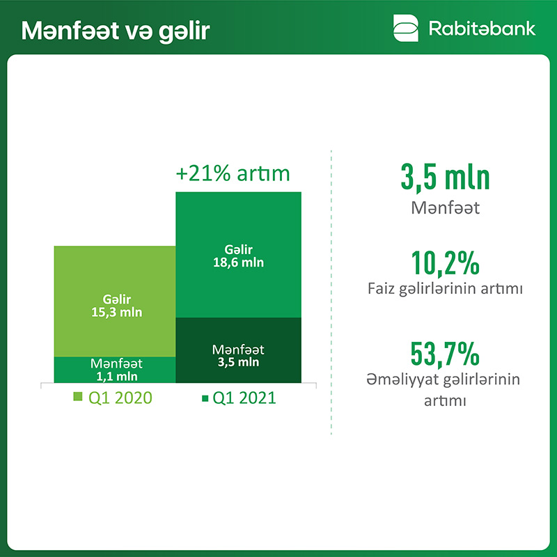 Belə ki, 31 mart 2021-ci il tarixinə bankın xalis mənfəəti 3.5 milyon manat təşkil etmişdir ki, bu da keçən ilin analoji dövri ilə müqayisədə 59% artım deməkdir.