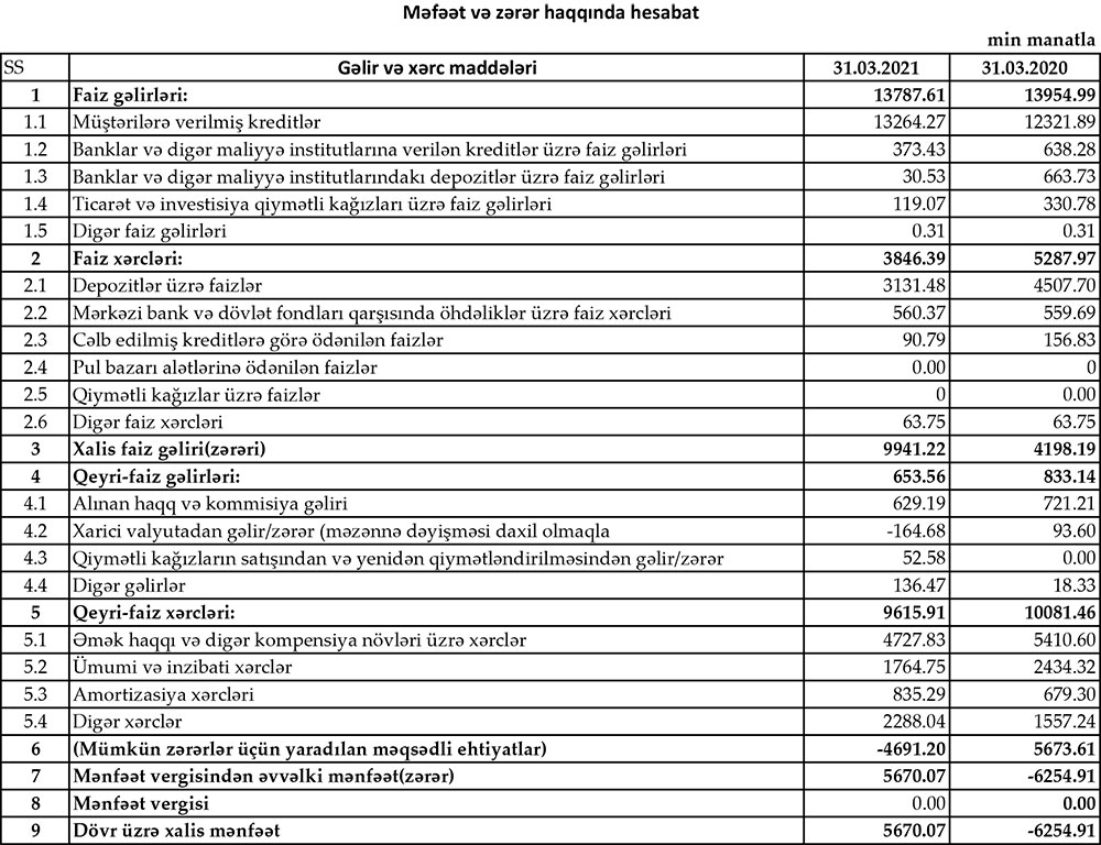 Müqayisə üçün qeyd edək ki, 2020-ci ilin ilk rübündə “Yelo Bank”ın cəmi əməliyyat gəlirləri 14 milyon 788 min manat, cəmi əməliyyat xərcləri 15 milyon 369 min manat təşkil etmişdi. Xərclər gəlirləri üstələdiyindən Bankın 581 min manat əməliyyat zərəri yaranmışdı. Eyni zamanda mümkün zərərlər üçün yaradılan məqsədli ehtiyatlara 5 milyon 674 min manat ayrıldığından zərər 6 milyon 255 min manata yüksəlmişdi.