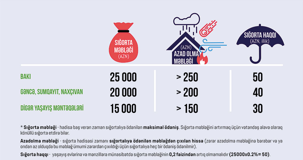 Hüquqi və fiziki şəxslərə məxsus tikililərin, yaşayış və qeyri-yaşayış sahələrinin, yaşayış evləri, binalarının və mənzillərin, habelə dövlət əmlakının sığortası icbaridir. Yaşayış binalarının, yaşayış evlərinin və mənzillərin icbari sığortası onların konstruktiv elementlərinə, otaqlarına, o cümlədən şüşələr də daxil olmaqla qapı və pəncərə konstruksiyalarına, su, kanalizasiya və qaz təchizatına, habelə istilik sisteminə aid borulara, rabitə, elektrik və digər naqillərinə, bəzək elementlərinə, o cümlədən bütün növ xarici, yaxud daxili mala və suvaq işlərinə, divar, tavan və döşəməyə dəyən zərərlərə təminat verir.