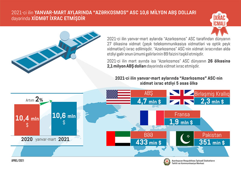 Marja “İxrac İcmalı”nın 2021-ci ilin aprel sayına istinadən xəbər verir ki, 2021-ci ilin yanvar-mart aylarıda “Azərkosmos” ASC tərəfindən dünyanın 27 ölkəsinə 10,6 milyon dollarlıq xidmət (peyk telekommunikasiya xidmətləri və optik peyk xidmətləri) ixrac edilib. Ötən ilin eyni dövründə ixrac 10,4 milyon dollar təşkil etmişdi.