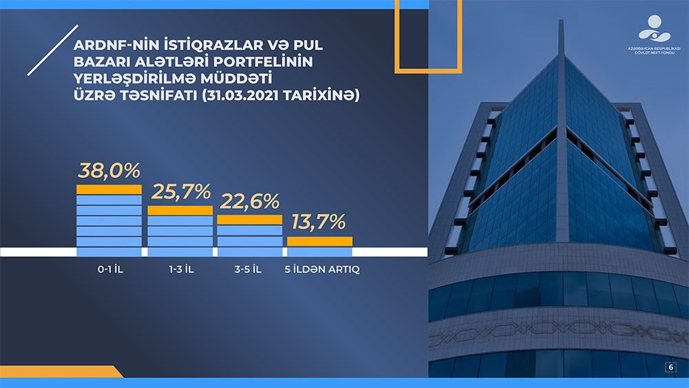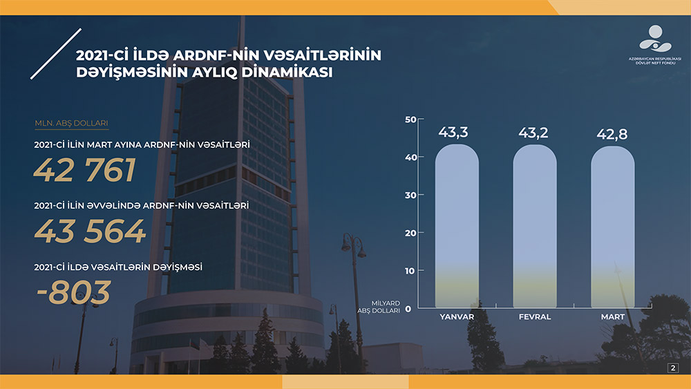 Cari ilin yanvar-mart ayları ərzində ARDNF-nin 2021-ci il büdcəsinin icrası çərçivəsində 2 milyard 513,7 milyon manat vəsait dövlət büdcəsinə transfert edilmişdir, “2019-2023-cü illər üçün Azərbaycan Respublikasında ali təhsil sisteminin beynəlxalq rəqabətliliyinin artırılması üzrə Dövlət Proqramı”nın maliyyələşdirilməsinə 0,7 milyon manat vəsait yönəldilmişdir. 2021-ci ilin ilk rübü ərzində ARDNF-nin idarə edilməsi ilə bağlı xərcləri 5,5 milyon manat təşkil etmişdir.