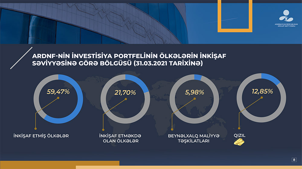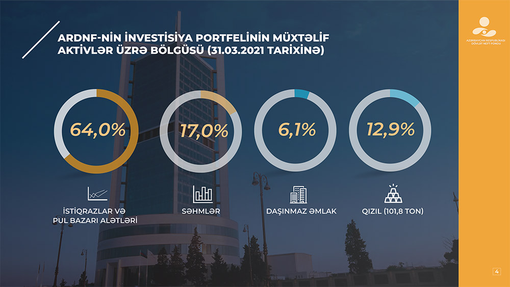 2021-ci il aprelin 1-ə Fondun aktivləri 2021-ci ilin əvvəlinə (43 milyard 564,3 milyon ABŞ dolları) nisbətən 1,84% azalaraq 42 milyard 761,3 milyon ABŞ dollarına bərabər olmuşdur. Büdcə gəlirlərinin büdcə xərclərini üstələməsinə baxmayaraq aktivlərin həcminin azalmasına səbəb qızılın qiymətinin düşməsi və investisiya portfelinin tərkibində yer alan əsas valyutaların məzənnələrinin ABŞ dollarına qarşı zəifləməsi olmuşdur.