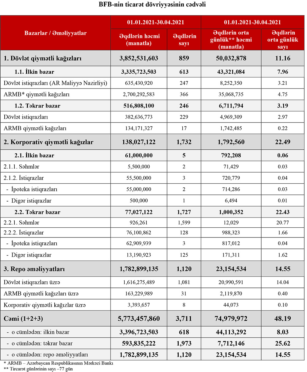 İlk 4 ayda əqdlərin sayı 247, əqdlərin orta günlük həcmi 8 milyon 252 min manat təşkil edib.
