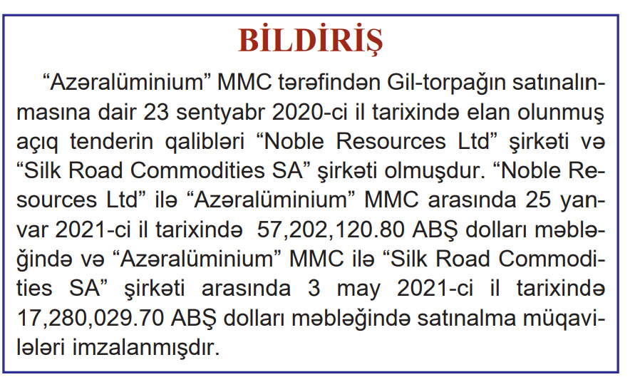 “Azərbaycan Sənaye Korporasiyası” ASC-nin törəmə müəssisəsi “Azəralüminium” MMC gil-torpağın alınması ilə bağlı elan etdiyi açıq tenderi yekunlaşdırıb.