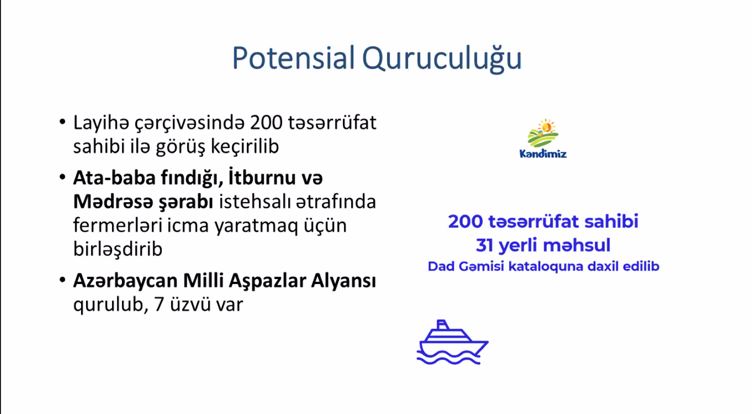Layihə çərçivəsində 200 təsərrüfat sahibi ilə görüş keçirilib. Ata-baba fındığı, itburnu və Mədrəsə şərabı istehsalı ətrafında fermerləri icma yaratmaq üçün birləşdirib. İstehsalçı qurupların istehsal edəcəkləri məhsulların həm yerli, həm də xarici bazarlarda təbliği nəzərdə tutulur.
