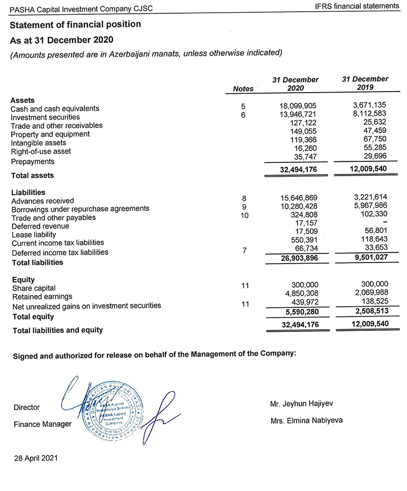 31 Dekabr 2020-ci il tarixində "PAŞA Kapital" 32 milyon 494 min manat cəmi aktivlərə malik olub, bu da 2019-cu ilin sonu ilə müqayisədə 2,7 dəfə çoxdur. Şirkət 31 Dekabr 2019-cu il tarixində 12 milyon 9 min manat cəmi aktivlərə malik idi. Aktivlərin artması nağd pulun və qiymətli kağızlara investisiyaların artması ilə əlaqədardır.