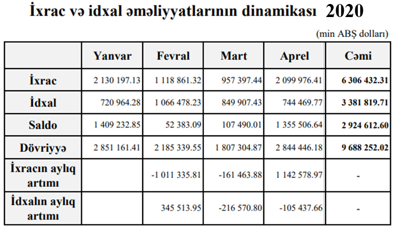 Lakin bu ilin ötən dövründə idxalın yüksək olması ilə əlaqədar olaraq Azərbaycanın xarici ticarət əməliyyatlarının həcmi cüzi artıb.2021-ci ilin ilk 4 ayında (yanvar-aprel) Azərbaycanın xarici ticarət əməliyyatlarının həcmi9 milyard 893 milyon 247 min ABŞ dolları təşkil edib. Ötən ilin eyni dövründə xarici ticarətin həcmi 9 milyard 688 milyon 252 min ABŞ dolları təşkil etmişdi.