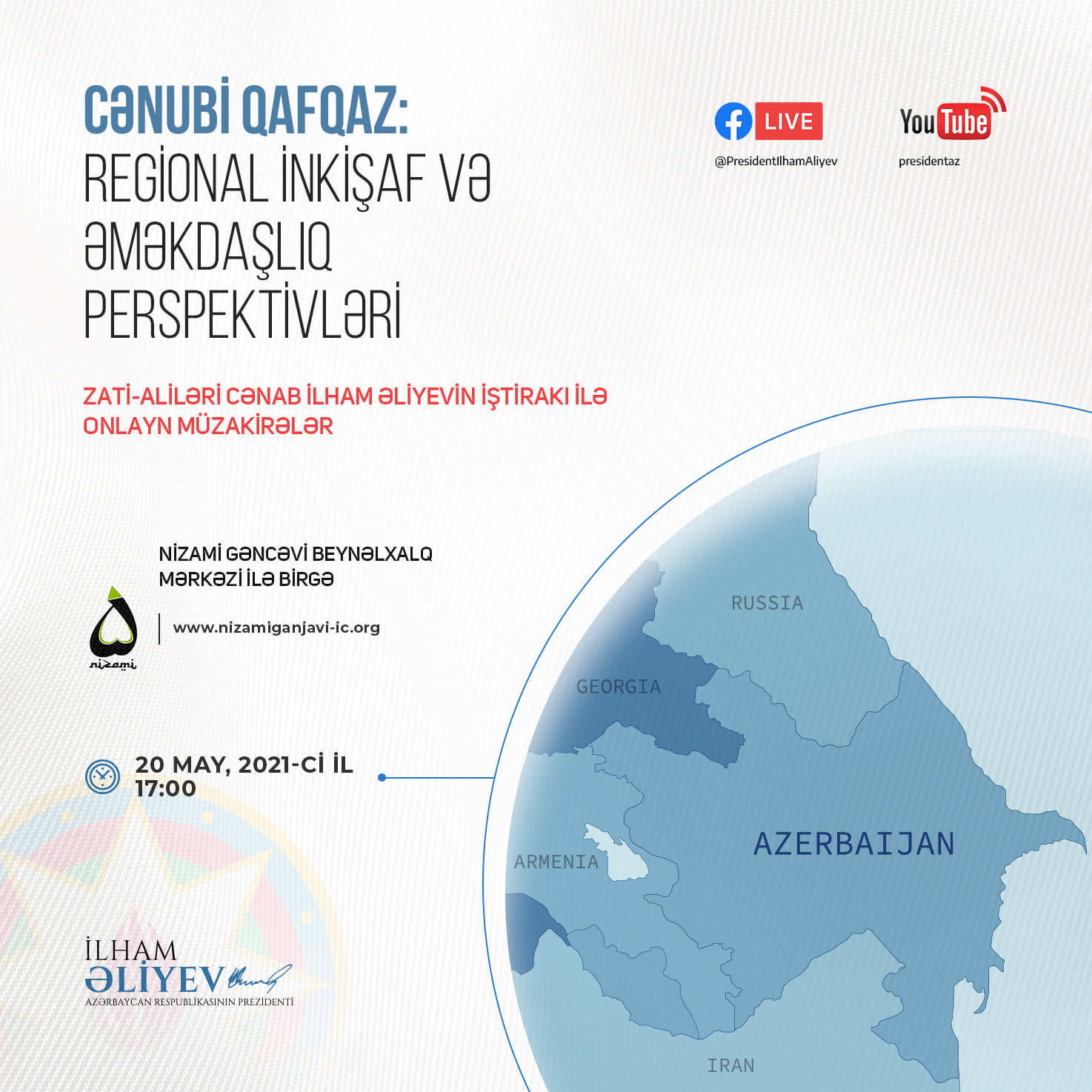 Azərbaycan Prezidenti İlham Əliyevin iştirakı ilə Nizami Gəncəvi Beynəlxalq Mərkəzinin “Cənubi Qafqaz: Regional inkişaf və əməkdaşlıq perspektivləri” adlı videoformatda müzakirələri bu gün saat 17:00-da keçiriləcək.