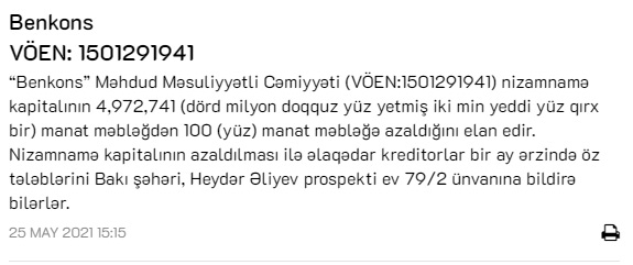 Yerli distubyutor şirkəti “Benkons” MMC, nizamnamə kapitalının 4 milyon 72 min 741 manat məbləğdən 100 manat məbləğə azaldığını elan edib.