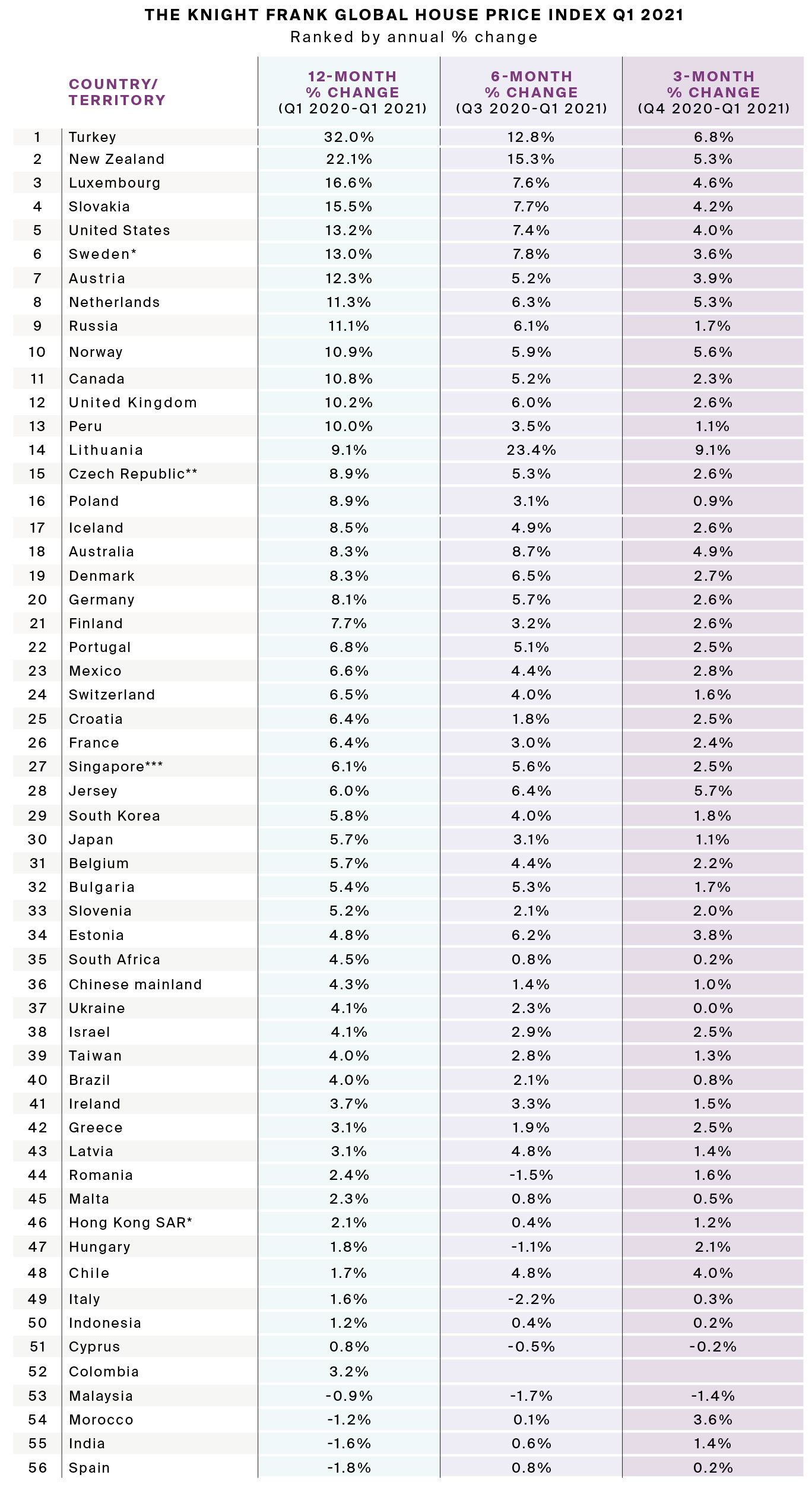 Daşınmaz əmlak qiymətləri ən çox Türkiyədə artıb. Bu dövrdə Türkiyədə daşınmaz əmlak qiymətləri 32% yüskəlib. Türkiyəni ardınca 22,1% artımla Yeni Zelandiya, 16,6% artımla Lüksemburq gəlir.