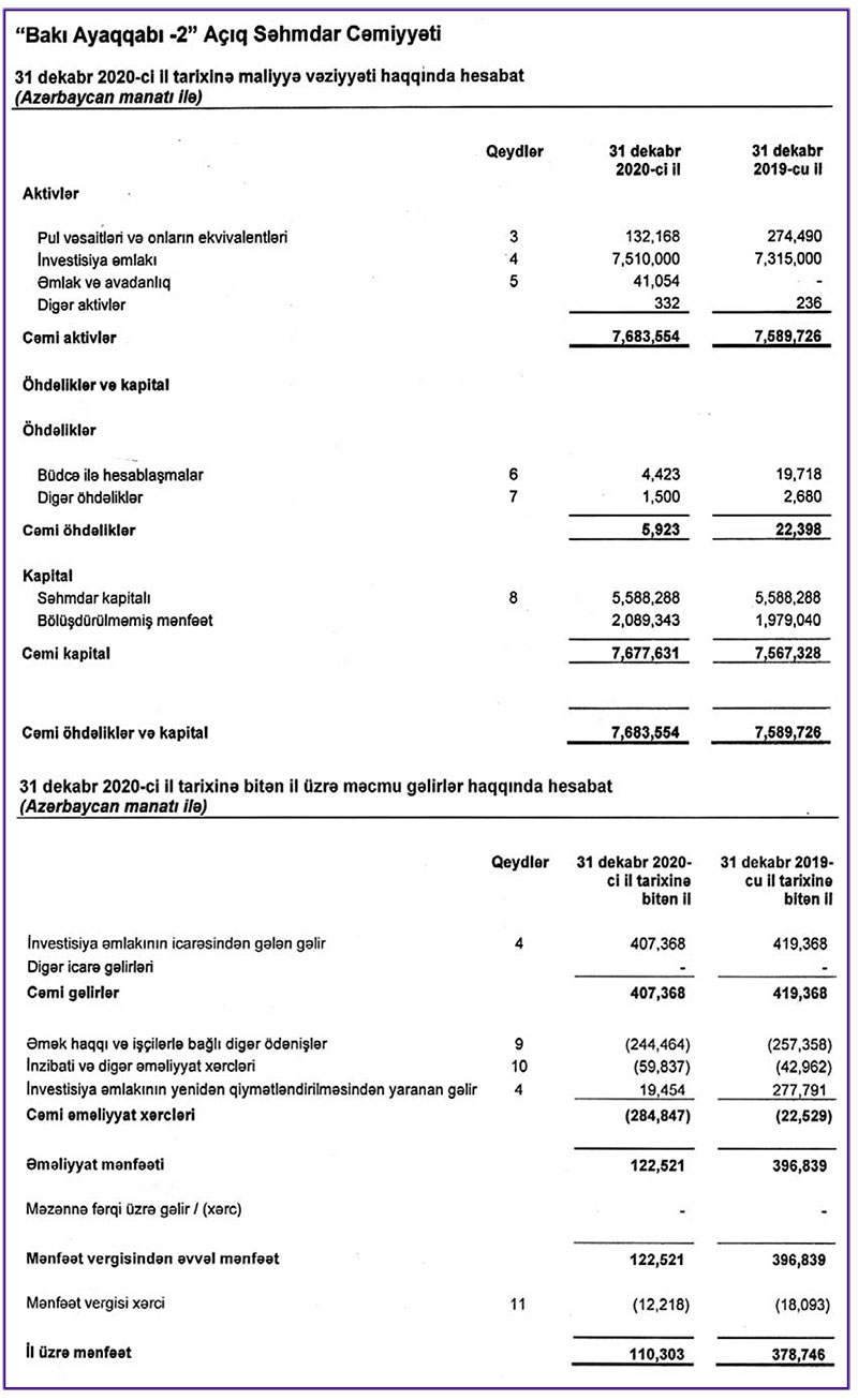 2019-cu ildə "Bakı Ayaqqabı - 2"nin investisiya əmlakının yenidən qiymətləndirilməsindən 278 min manat gəliri yarandığı halda, 2020-ci ildə bu gəlir 19 min manat təşkil edib (9 dəfədən çox azalıb).