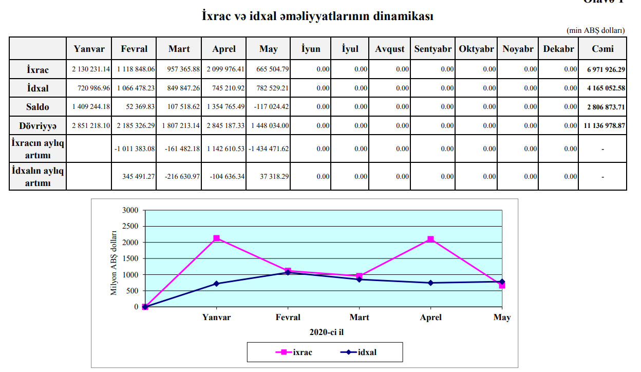 Qeyd edək ki, 2020-ci ilin ilk 5 ayında Azərbaycanın xarici ticarət əməliyyatlarının həcmi 11 milyard 136 milyon 979 min ABŞ dolları, o cümlədən idxal 4 milyard 165 milyon 52 min dollar, ixrac 6 milyard 971 milyon 926 min dollar, saldo 2 milyard 806 milyon 873 min dollar təşkil etmişdi.