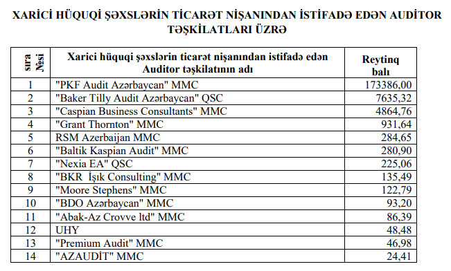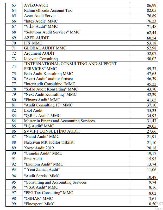 Auditorlar Palatası 2020-ci ildə Azərbaycanda auditor xidməti göstərmiş hüquqi və fiziki şəxslərin reytinqini açıqlayıb.