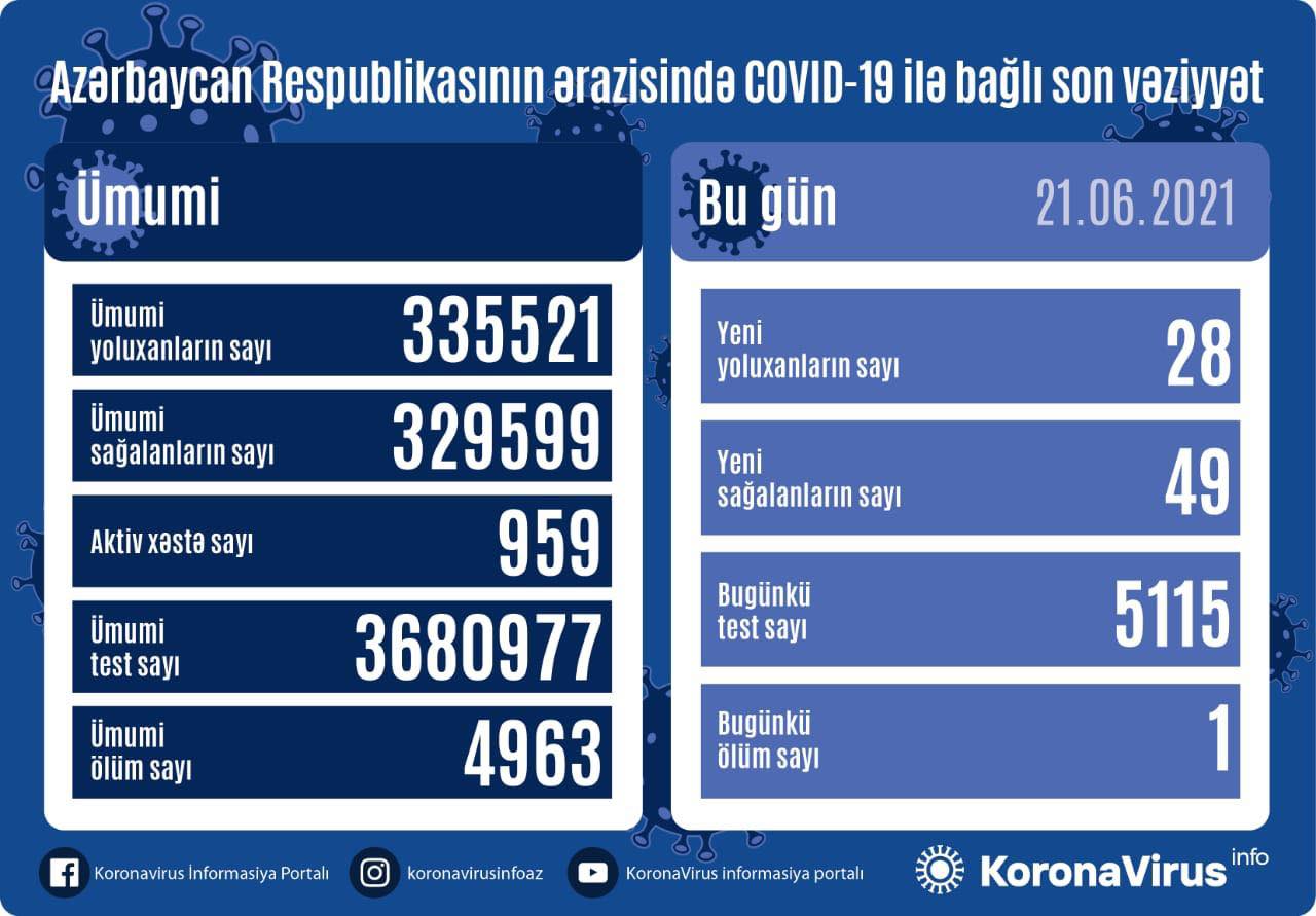 Azərbaycan Respublikasında koronavirus (COVID-19) infeksiyasına 28 yeni yoluxma faktı qeydə alınıb, 49 nəfər müalicə olunaraq sağalıb.