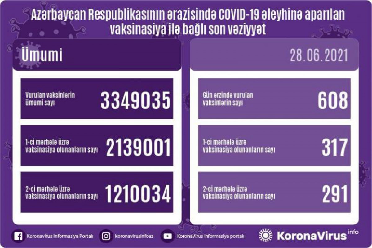 Ölkədə vurulan vaksinlərin ümumi sayı 3 349 035, birinci mərhələ üzrə vaksinasiya olunanların ümumi sayı 2 139 001, ikinci mərhələ üzrə vaksinasiya olunanların sayı isə 1 210 034 təşkil edir.