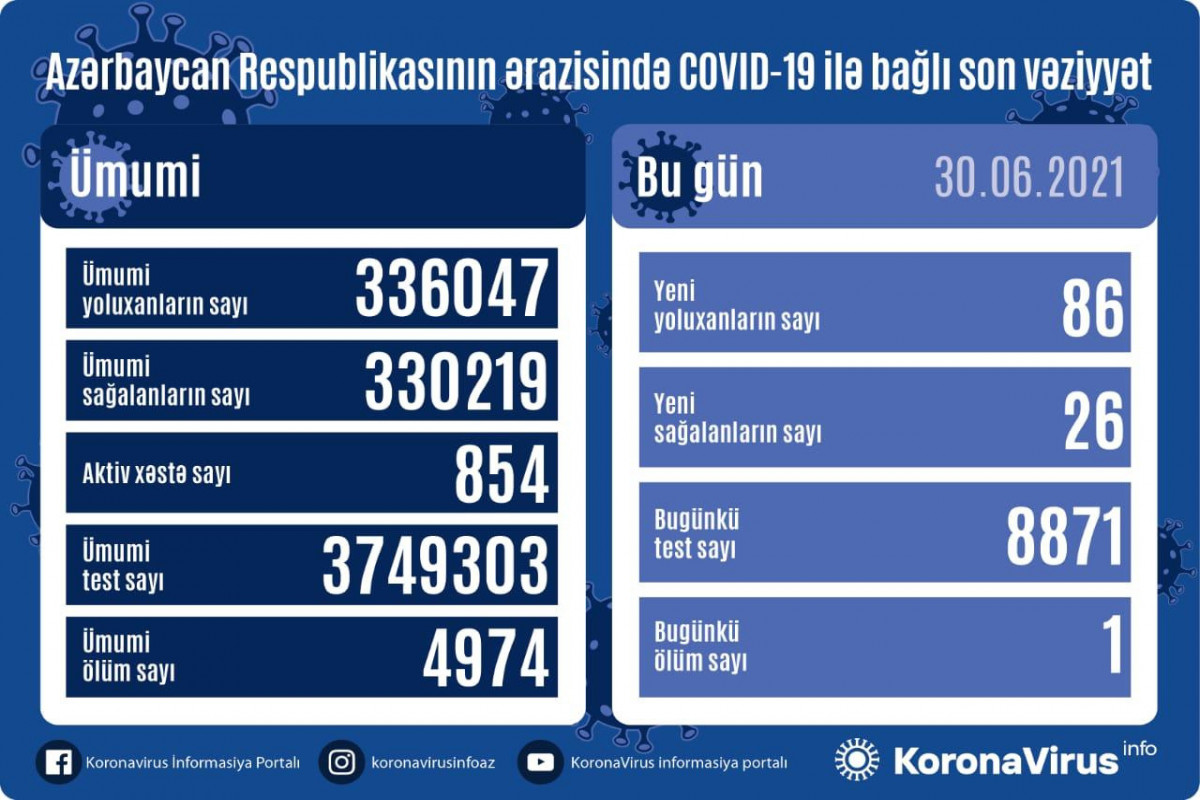 Azərbaycan Respublikasında koronavirus (COVID-19) infeksiyasına 86 yeni yoluxma faktı qeydə alınıb, 26 nəfər müalicə olunaraq sağalıb.