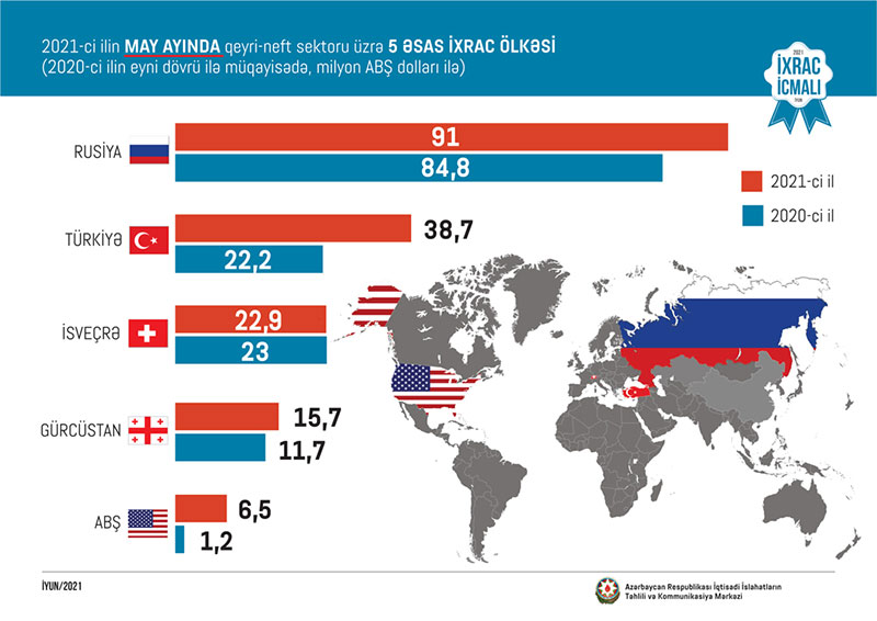 2021-ci ilin yanvar-may ayları ərzində Rusiyaya 279,5 milyon, Türkiyəyə255 milyon, İsveçrəyə 91,1 milyon, Gürcüstana 69,1 milyon və ABŞ 29,5 milyon ABŞ dolları dəyərində qeyri-neft sektoruna aid mal ixrac olunub.