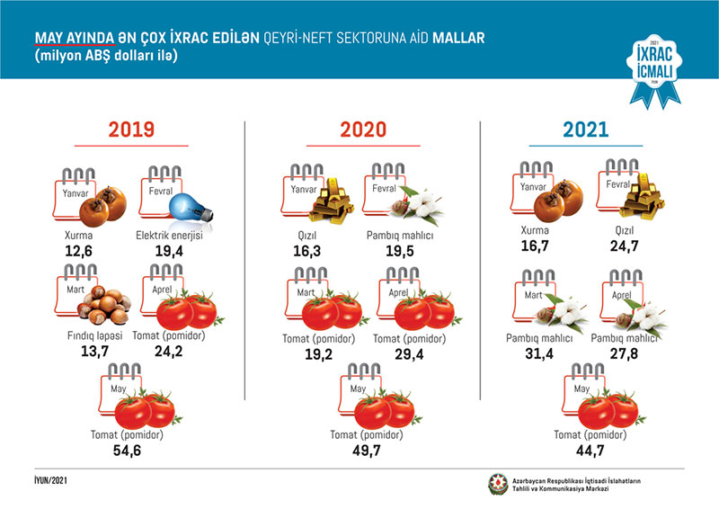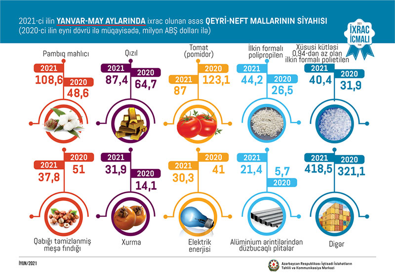 2021-ci ilin may ayı Azərbaycanın ümumi ixracı 1,6 milyard ABŞ dolları, qeyri-neft sektoru üzrə ixrac 210,5 milyon ABŞ dolları təşkil edib. Qeyri-neft sektoru üzrə ixrac ötən ilin may ayı ilə müqayisədə 22 faiz və ya 38 milyon ABŞ dolları daha çoxdur. Habelə, 2021-ci ilin qeyri-neft sektorunun tərkibi üzrə yeyinti məhsullarının ixracı 85,4 milyon ABŞ dolları, qeyri-yeyinti məhsulları üzrə isə 125,1 milyon ABŞ dolları təşkil edib. 2021-cu ilin may ayında qeyri-neft sektoruna aid ən çox mal ixrac edilən ölkələrin siyahısında Rusiya (91 milyon ABŞ dolları) birinciliyə yüksəlib. Bu siyahıda Türkiyə ikinci (38,7 milyon ABŞ dolları) və İsveçrə üçüncü (22,9 milyon ABŞ dolları) olub.