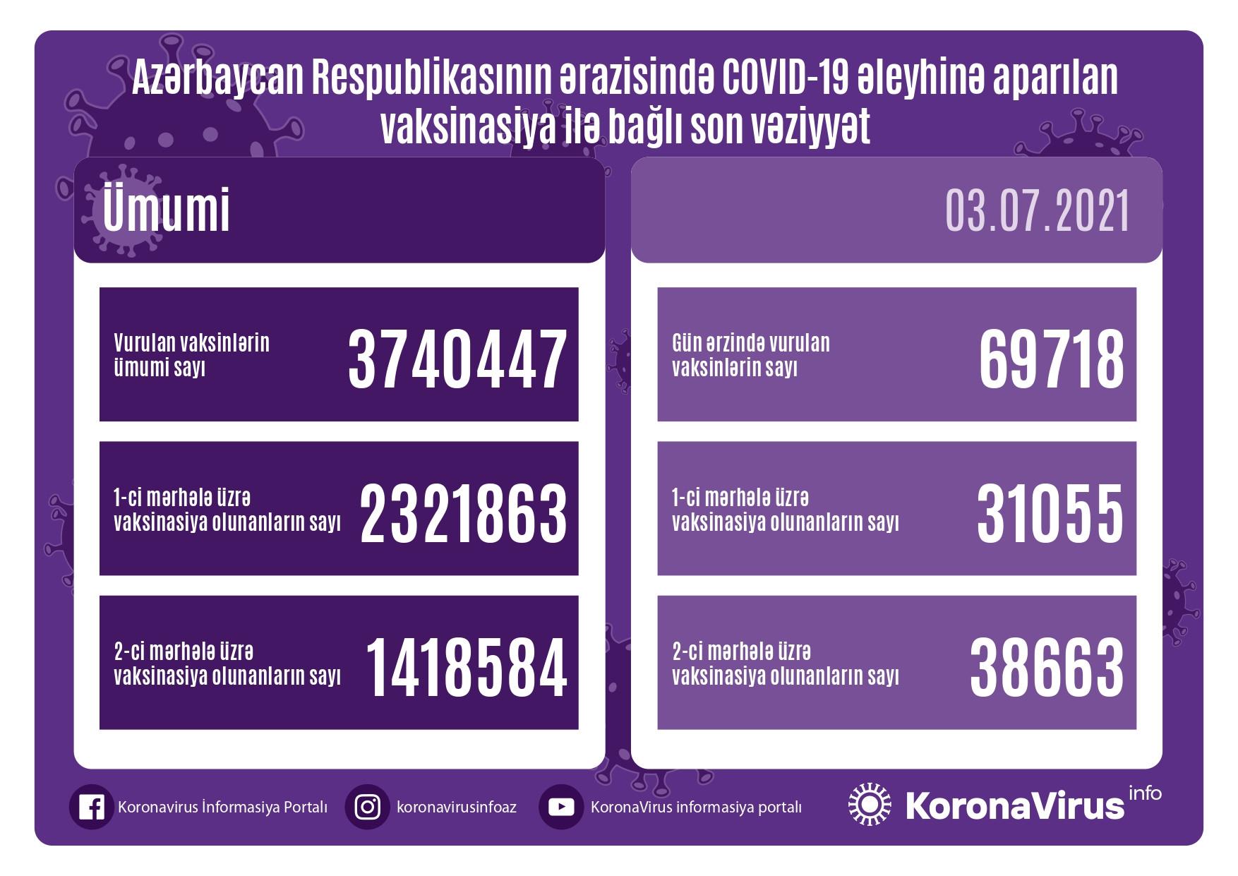 Azərbaycanda son sutkada koronavirus (COVID-19) əleyhinə 69 718 vaksin vurulub.