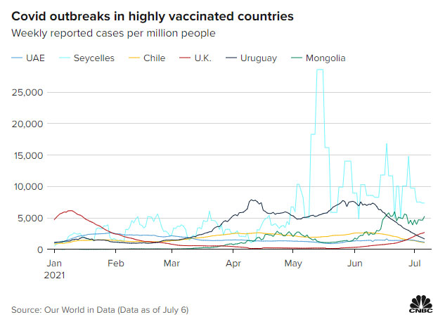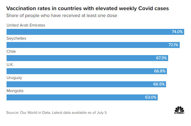 Marja CNBC-yə istinadən xəbər verir ki, həftəlik yoluxma tempinə görə lider ola 36 ölkədən 6-sında əhalinin 60%-indən çoxu koronavirus peyvəndinin ən azı bir dozasını qəbul edib. Bunlar Birləşmiş Ərəb Əmirlikləri (74%), Böyük Britaniya (66,8%), Seyşel adaları (72%), Çili (67,3%), Uruqvay (66,5%) və Monqolustandır (63%).