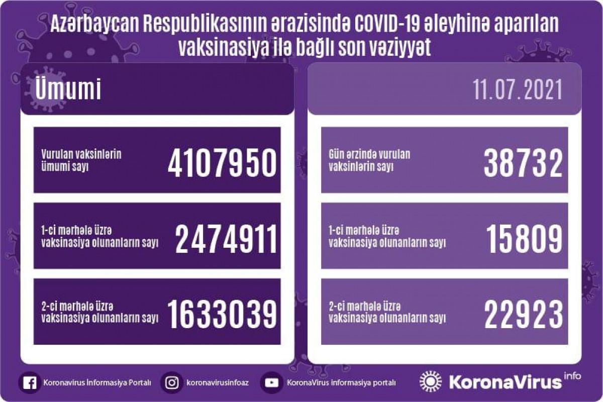 Ölkədə vurulan vaksinlərin ümumi sayı 4 107 950, birinci mərhələ üzrə vaksinasiya olunanların ümumi sayı 2 474 911, ikinci mərhələ üzrə vaksinasiya olunanların sayı isə 1 633 039 təşkil edir.