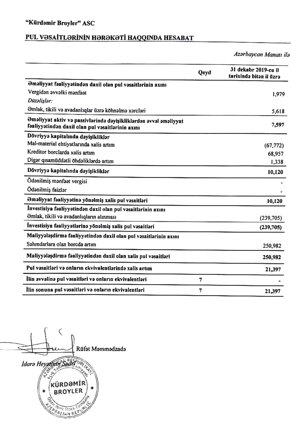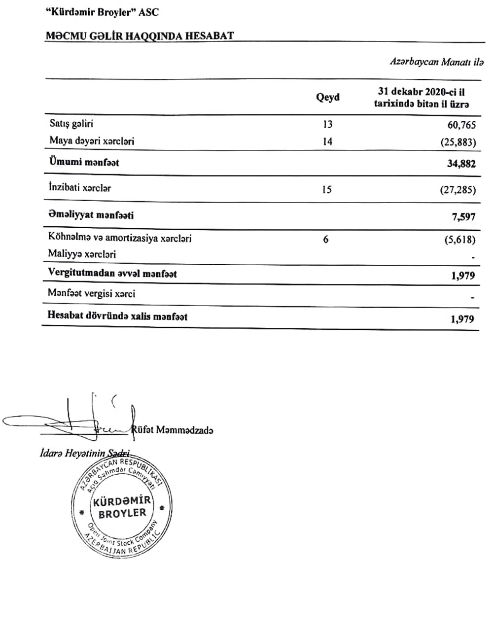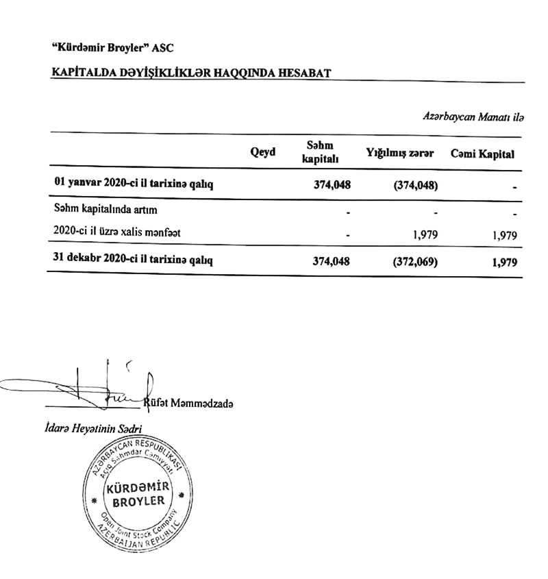 "Kürdəmir Broyler" Açıq Səhmdar Cəmiyyətinin 31 dekabr 2020-ci il tarixində bitən il üzrə ilkin maliyyə hesabatlarını və müstəqil auditorun hesabatını açıqladı.2020-ci ildə fəaliyyəti bərpa edilən “Kürdəmir Broyler” ASC maliyyə göstəricilərini açıqlayıb.