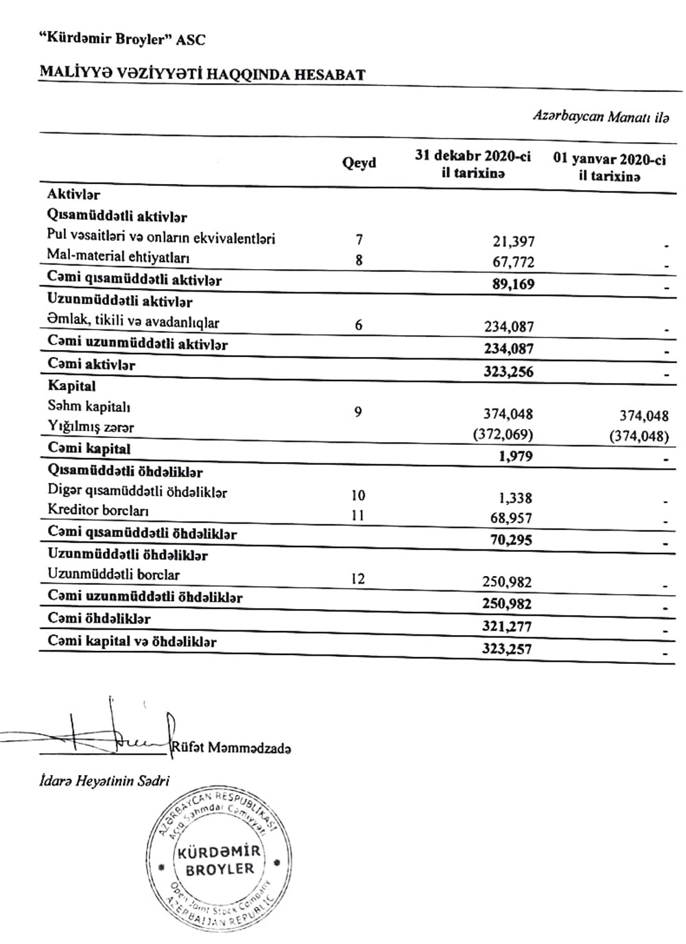 31 Dekabr 2020-ci il tarixində “Kürdəmir Broyler” ASC 323 min 256 manat cəmi aktivlərə malik olub.
