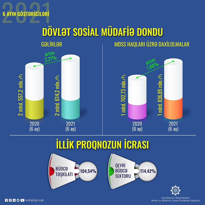 Əmək və Əhalinin Sosial Müdafiəsi Nazirliyinin tabeliyindəki Dövlət Sosial Müdafiə Fondunun (DSMF) gəlirləri 2021-ci ilin birinci yarımilində ötən ilin müvafiq dövrünə nisbətən 2,21% (57 mln. manat) artaraq 2 mlrd. 614,2 mln. manat təşkil edib.