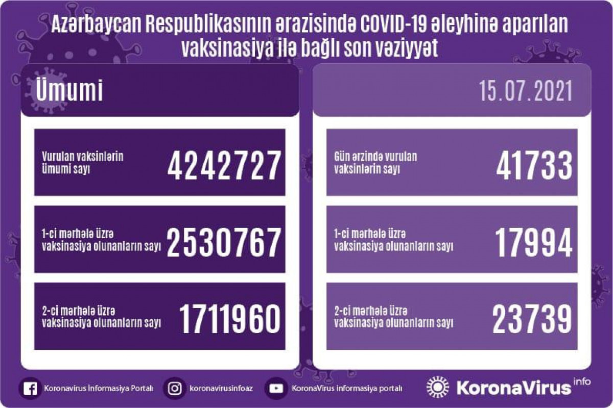 Ölkədə vurulan vaksinlərin ümumi sayı 4 242 727, birinci mərhələ üzrə vaksinasiya olunanların ümumi sayı 2 530 767, ikinci mərhələ üzrə vaksinasiya olunanların sayı isə 1 711 960 təşkil edir.