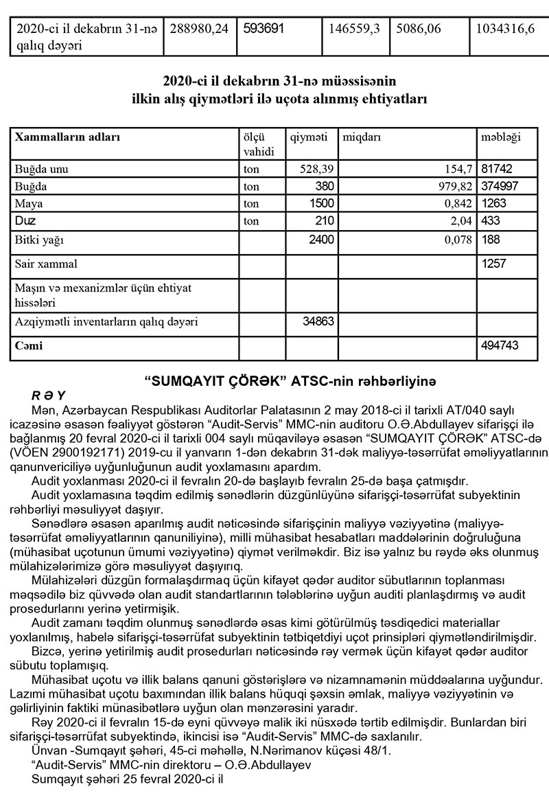 “SUMQAYIT-ÇÖRƏK” ASC-nin 2020-ci il dekabrın 31-nə mühasibat balansı