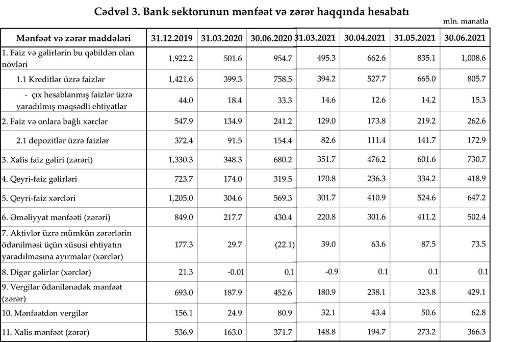 Bank sektorunda daha çox kreditin ödənişində gecikmə olacağı gözlənilir. Banklar bu məqsədlə ehtiyat yaratmağı gücləndiriblər. Belə ki, 2021-ci ilin 1-ci yarısında bank sektoru aktivlər üzrə mümkün zərərlərin ödənilməsi üçün xüsusi ehtiyatın yaradılmasına 73,5 milyon manat ayırıblar. Halbuki, 2020-ci ilin eyni dövründə sektor ayırma etməmiş, əksinə əvvəlki dövrlərdə yaradılmış ehtiyatdan 22,1 milyon manat azad olmuşdu. 2021-ci ilin 1-ci yarısında bankların kreditlər üzrə ehtimal olunan zərərin ödənilməsi üçün xüsusi fonda daha çox vəsait ayırması qeyri-qənaətbəxş, təhlükəli və ya ümidsiz kreditlərin artdığına işarədir.