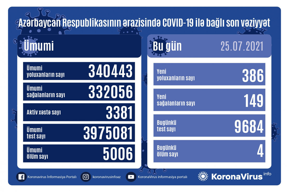 Azərbaycan Respublikasında koronavirus (COVID-19) infeksiyasına 386 yeni yoluxma faktı qeydə alınıb, 149 nəfər müalicə olunaraq sağalıb.