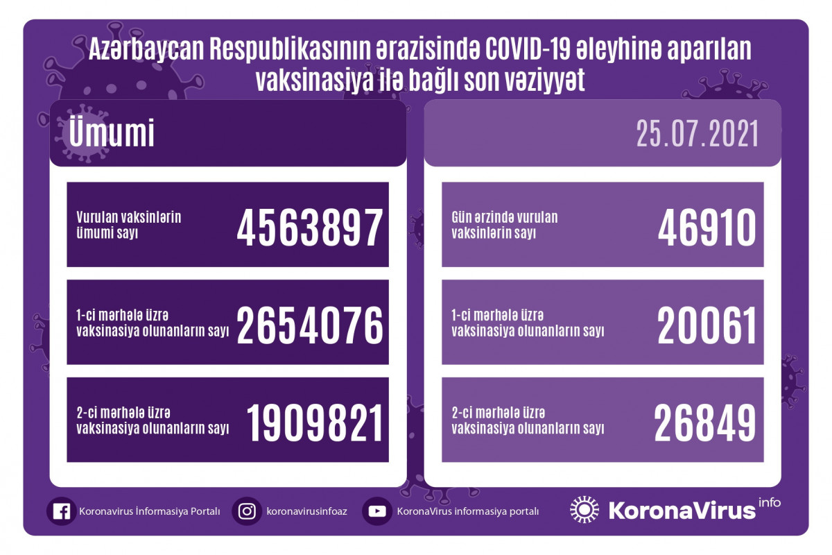 Azərbaycanda son sutkada koronavirus (COVID-19) əleyhinə 46 910 vaksin vurulub.